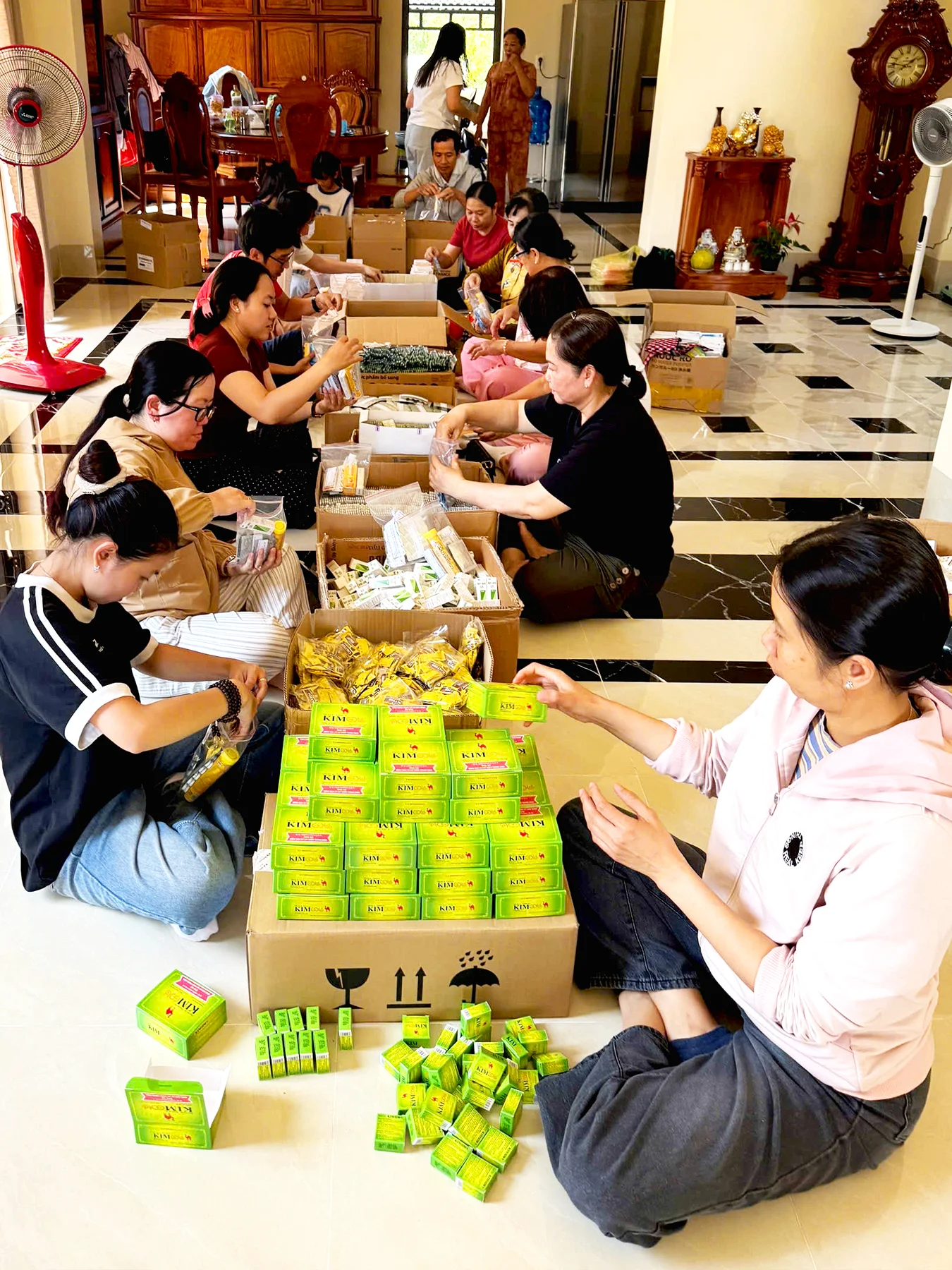 Các tình nguyện viên tập kết và đóng gói các túi thuốc cứu trợ tại Chùa Đức Lâm, đảm bảo sự khẩn trương và chu đáo trong khâu chuẩn bị.