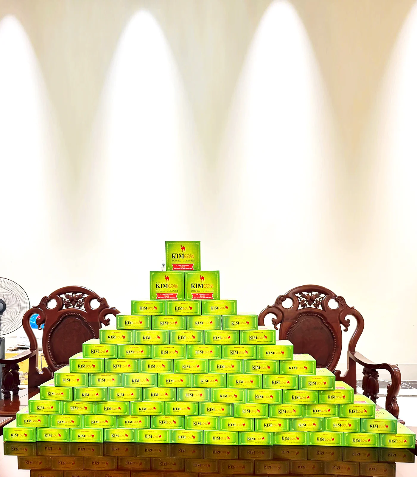Hình ảnh các hộp dầu Kimgold được xếp thành hình tháp, được công ty gửi tặng bà con miền Trung.